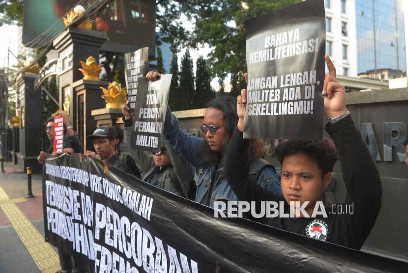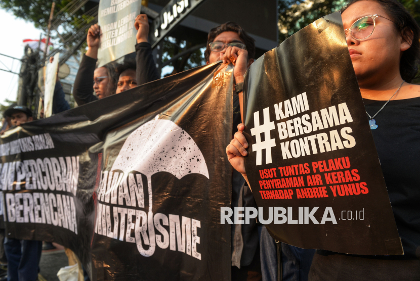 Sejumlah orang dari Kolektif Merpati menggelar aksi dukungan kepada Andrie Yunus di depan Markas Pusat Polisi Militer Angkatan Darat, Jakarta, Kamis (16/4/2026). Aksi yang berlangsung singkat ini menuntut agar para tersangka dalam kasus penyiraman air keras terhadap aktivis KontraS Andrie Yunus diadili melalui peradilan umum (sipil). Aksi ini juga sebagai bentuk dukungan terhadap Andrie Yunus. (FOTO : Republika/Prayogi)