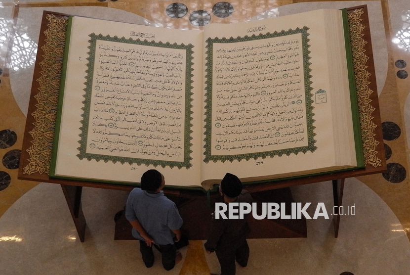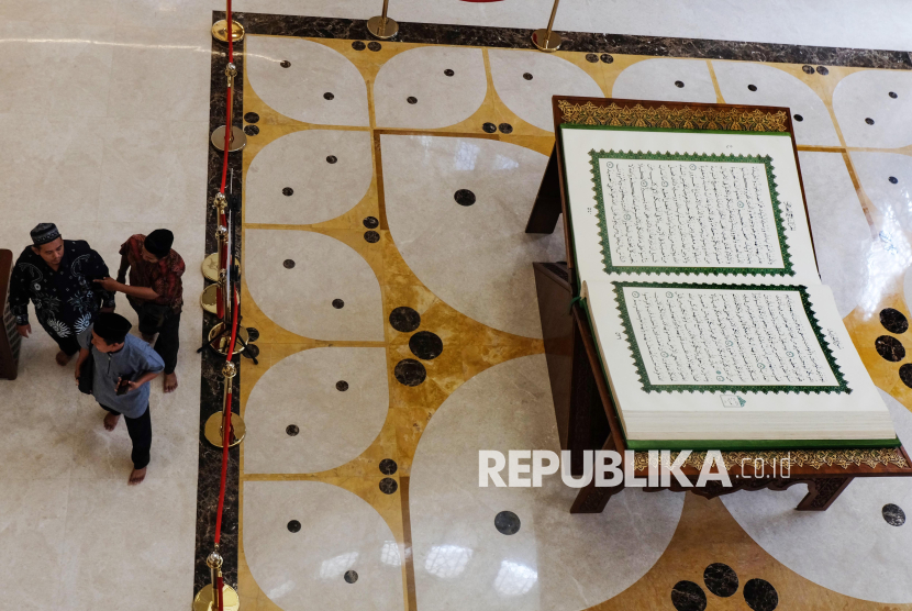 REPUBLIKA.CO.ID, SOLO -- Tamu didampingi petugas mengamati mushaf kitab suci Alquran berukuran jumbo 3 X 2 meter di Masjid Raya Sheikh Zayed, Solo, Jawa Tengah, Sabtu (28/2/2026).