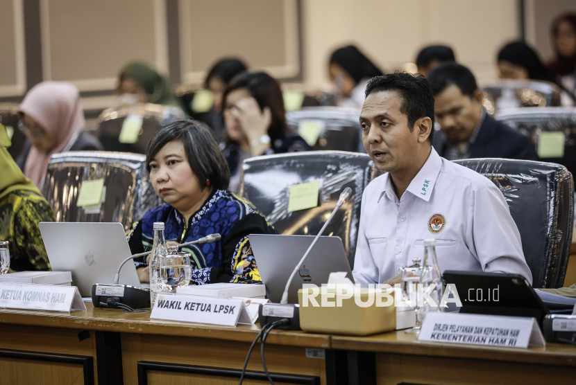Wakil Ketua LPSK Wawan Fahrudin (kanan) bersama Ketua Komnas HAM Anis Hidayah (kiri) menyampaikan paparan pada Rapat Dengar Pendapat (RDP) dengan Komisi XIII DPR di Kompleks Parlemen, Senayan, Jakarta, Senin (2/2/2026). Komisi XIII DPR mendesak aparat penegak hukum mengusut tuntas sesuai KUHP atas pelanggaran pidana dan HAM yang dialami nenek Saudah yang dilakukan pemilik dan pekerja tambang ilegal di Kecamatan Rao Kabupaten Pasaman Sumatera Barat. (FOTO : ANTARA FOTO/Dhemas Reviyanto)