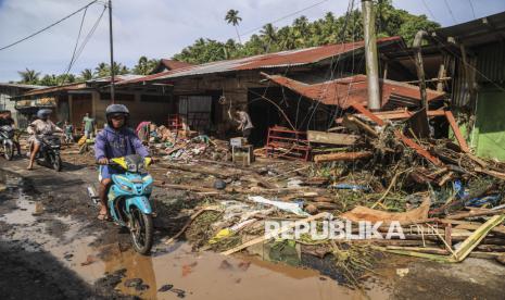 Pengendara sepeda motor melintas di depan rumah warga yang rusak pascabanjir di Desa Tongute Ternate asal Kabupaten Halmahera Barat, Maluku Utara, Kamis (8/1/2026). Berdasarkan data sementara BPBD Kabupaten Halmahera Barat, sebanyak empat desa terdampak bencana banjir di Kecamatan Ibu yaitu Desa Gamlamo, Desa Tongute Ternate asal, Desa Gam Ici, dan Tongute Ternate serta 11 rumah rusak berat, 100 rumah rusak ringan dan 3.444 jiwa terdampak akibat banjir pada Rabu (7/1) pukul 04.00 WIT di wilayah itu. (FOTO : ANTARA FOTO/Andri Saputra)