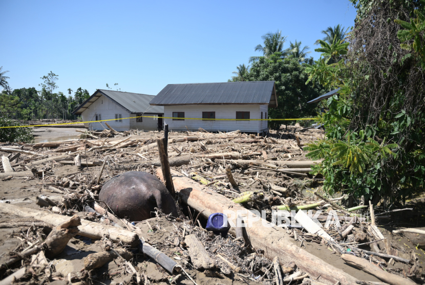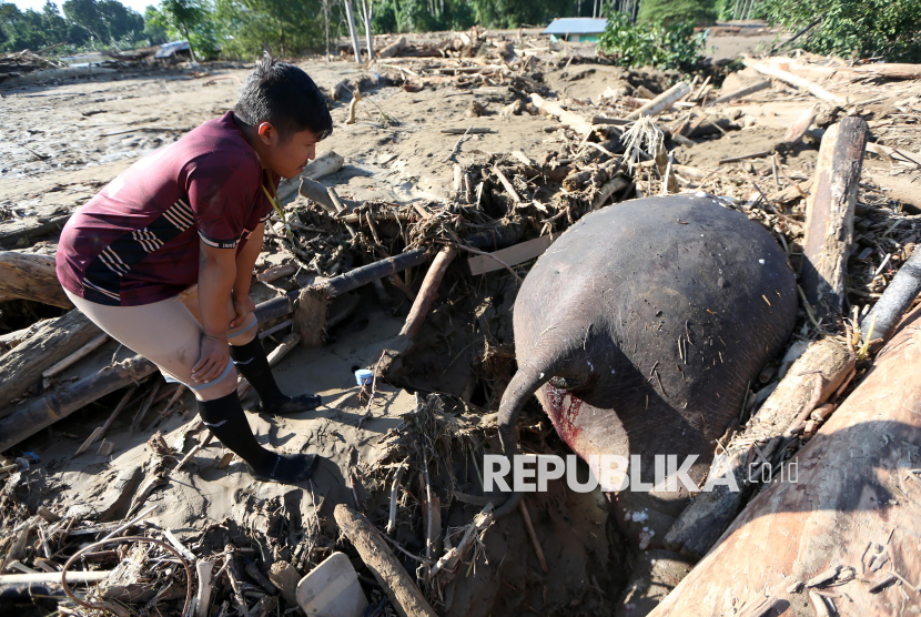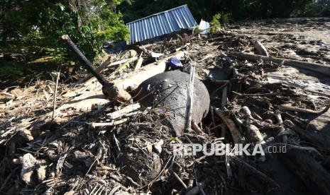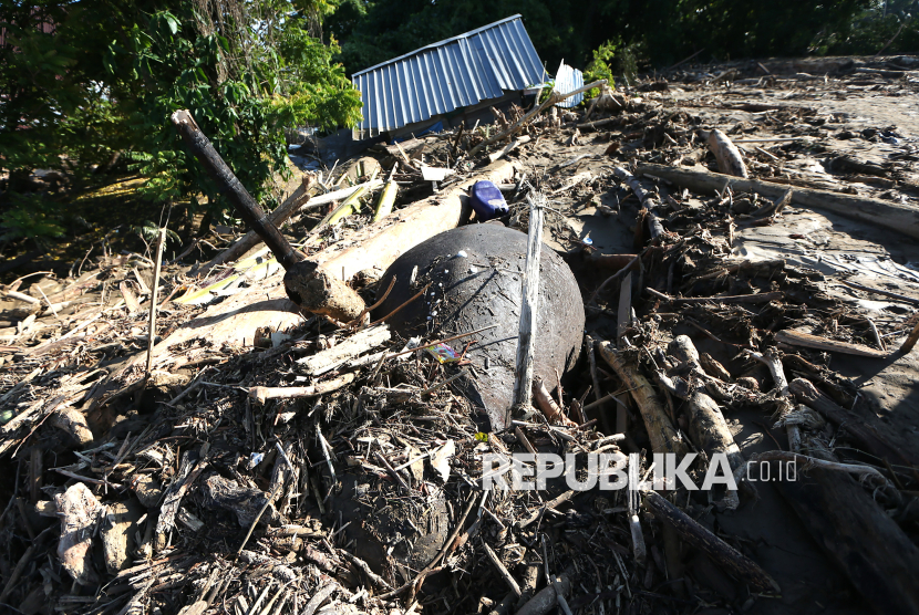 REPUBLIKA.CO.ID, ACEH -- Bangkai gajah sumatera (Elephas maximus sumatranus) tertimbun material yang terbawa air saat terjadi banjir di Desa Meunasah Lhok, Pidie Jaya, Aceh, Sabtu (29/11/2025).