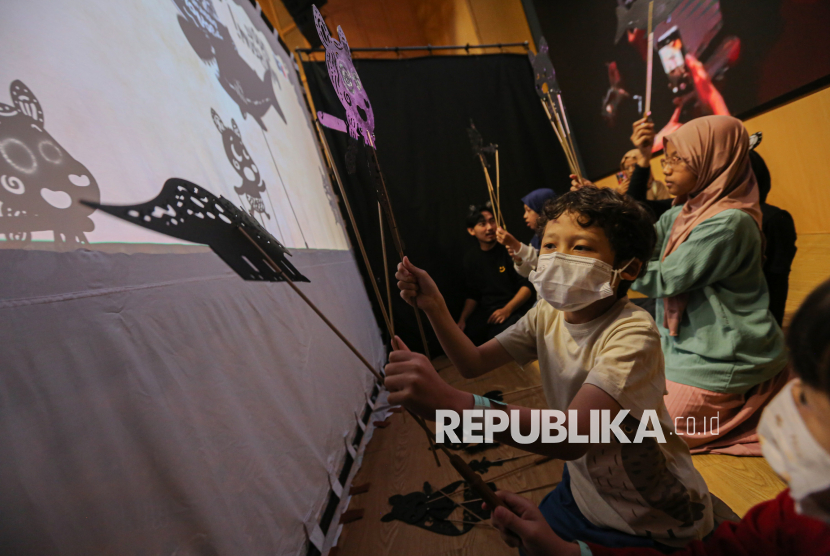Anak-anak mengikuti kegiatan praktik memainkan wayang saat gelaran Aniwayang Desa Timun di Museum Nasional, Jakarta, Sabtu (25/4/2026). Museum Nasional bersama Aniwayang menggelar pagelaran wayang dengan tema Desa Timun yang menceritakan tentang sejarah Museum Nasional dengan tujuan memperkenalkan kesenian wayang sejak usia dini. (FOTO : Republika/Thoudy Badai)