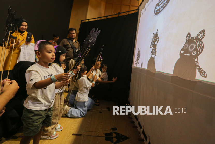 Peserta mengikuti kegiatan praktik memainkan wayang saat gelaran Aniwayang Desa Timun di Museum Nasional, Jakarta, Sabtu (25/4/2026). Museum Nasional bersama Aniwayang menggelar pagelaran wayang dengan tema Desa Timun yang menceritakan tentang sejarah Museum Nasional dengan tujuan memperkenalkan kesenian wayang sejak usia dini. (FOTO : Republika/Thoudy Badai)