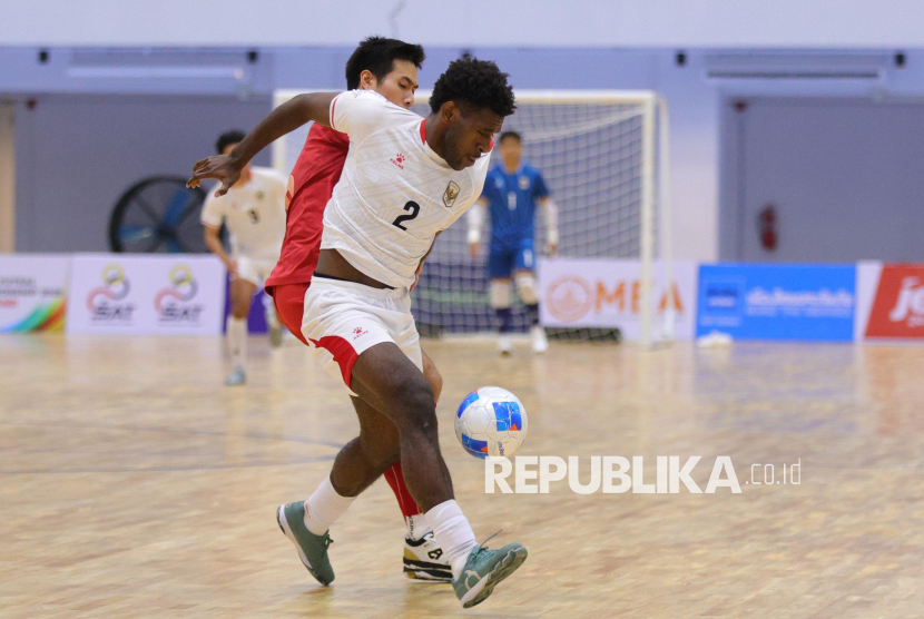 Pemain timnas futsal Indonesia Andarias Kareth berusaha melewati adangan pemain Thailand saat pertandingan final Piala AFF Futsal 2026 di Nonthaburi Hall, Bangkok, Thailand, Ahad (12/4/2026). Indonesia gagal menjadi juara dalam kejuaraan itu setelah dikalahkan Thailand dengan skor 1-2. (FOTO : Dok FFI)