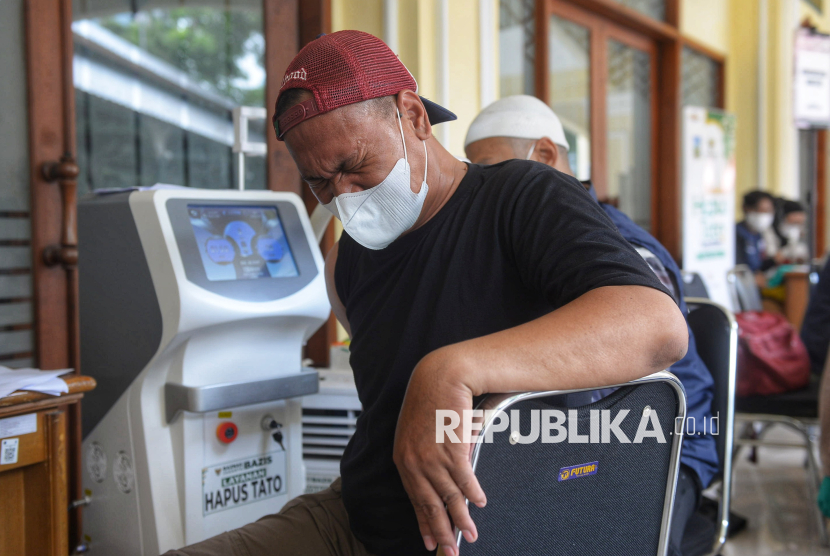 Peserta bersiap menghapus tato menggunakan laser di Masjid Sunda Kelapa, Jakarta, Selasa (24/2/2026). Baznas Bazis DKI Jakarta mengelar roadshow layanan hapus tato gratis bagi masyarakat yang ingin berhijrah di berbagai wilayah Jakarta. Program ini menargetkan sekitar 1.000 peserta. Pendaftaran dibuka mulai 23 Februari hingga 4 Maret 2026 melalui laman daring. Kegiatan hapus tato bertujuan memberikan kesempatan kepada masyarakat yang ingin berhijrah dan memperbaiki diri. (FOTO : Republika/Prayogi)