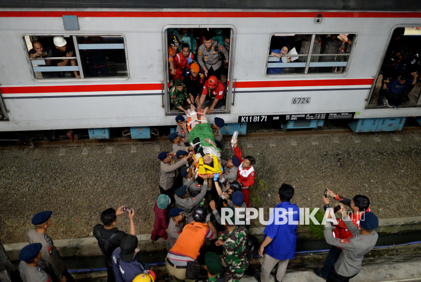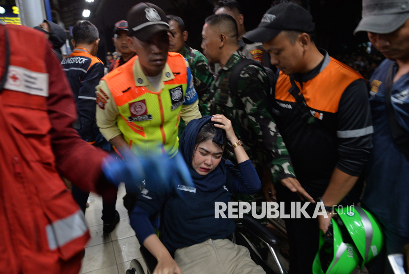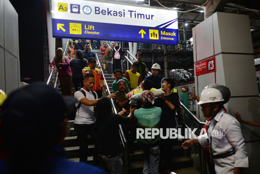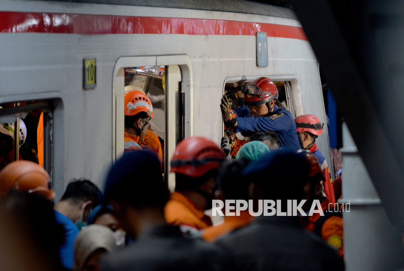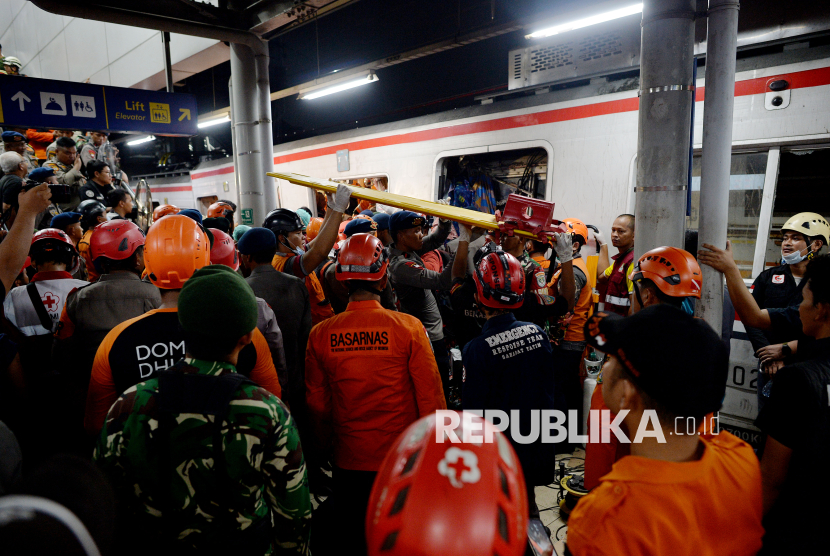 Petugas gabungan mengevakuasi korban selamat kecelakaan KRL Commuterline dan KA Argo Bromo Anggrek relasi Gambir-Surabaya Pasar Turi di Stasiun Bekasi Timur, Bekasi, Jawa Barat, Selasa (28/4/2026). Hingga Selasa pagi tercatat sebanyak 14 orang meninggal dunia dan 84 korban luka-luka akibat Kecelakaan KRL Commuterline dan KA Argo Bromo Anggrek. (FOTO : Edwin Putranto/Republika)