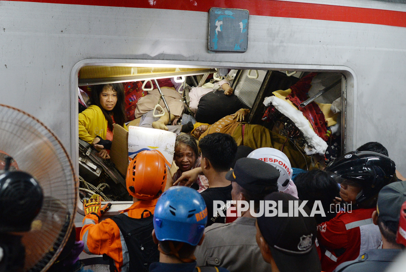 Korban selamat kecelakaan KRL Commuterline dan KA Argo Bromo Anggrek relasi Gambir-Surabaya Pasar Turi yang masih terjebak dalam gerbong menunggu untuk dievakuasi di Stasiun Bekasi Timur, Bekasi, Jawa Barat, Selasa (28/4/2026). Hingga Selasa pagi tercatat sebanyak 14 orang meninggal dunia dan 84 korban luka-luka akibat Kecelakaan KRL Commuterline dan KA Argo Bromo Anggrek. (FOTO : Edwin Putranto/Republika)