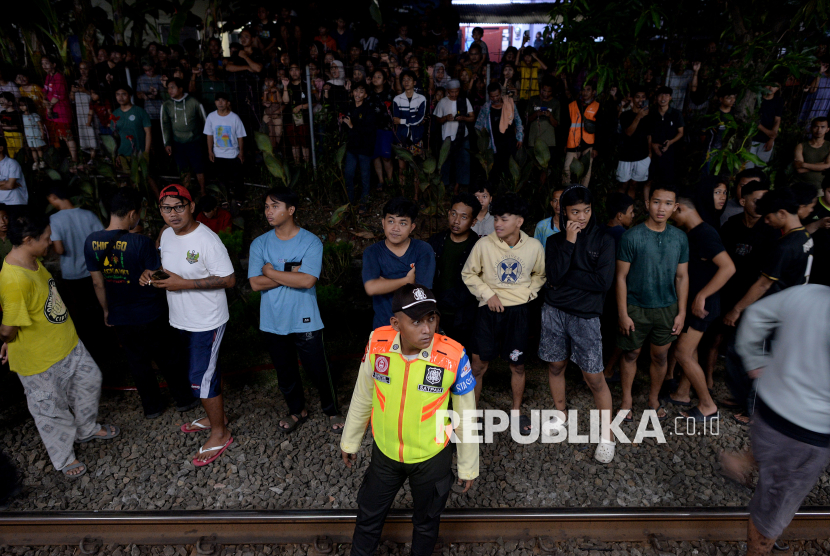 Warga menyaksikan proses evakuasi korban kecelakaan KRL Commuterline dan KA Argo Bromo Anggrek relasi Gambir-Surabaya Pasar Turi yang masih terjebak dalam gerbong di Stasiun Bekasi Timur, Bekasi, Jawa Barat, Selasa (28/4/2026). Hingga Selasa pagi tercatat sebanyak 14 orang meninggal dunia dan 84 korban luka-luka akibat Kecelakaan KRL Commuterline dan KA Argo Bromo Anggrek. (FOTO : Edwin Putranto/Republika)
