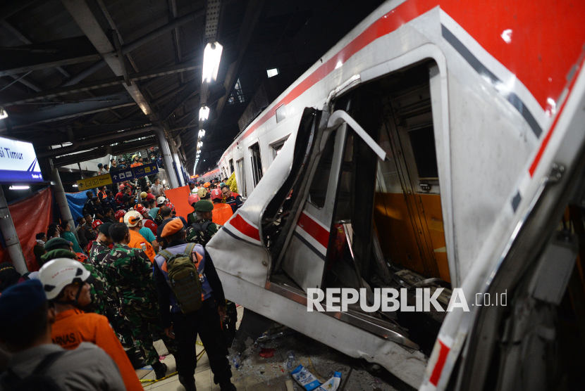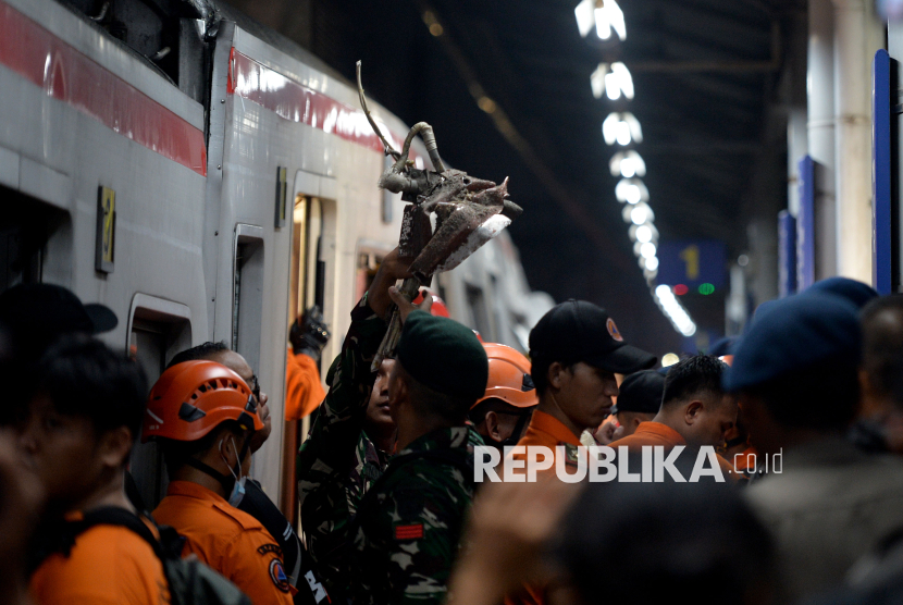 REPUBLIKA.CO.ID, BEKASI -- Petugas gabungan berusaha mengevakuasi korban kecelakaan KRL Commuterline dan KA Argo Bromo Anggrek relasi Gambir-Surabaya Pasar Turi yang masih terjebak dalam gerbong di Stasiun Bekasi Timur, Bekasi, Jawa Barat, Selasa (28/4/2026). Hingga Selasa pagi tercatat sebanyak 14 orang meninggal dunia dan 84 korban luka-luka akibat Kecelakaan KRL Commuterline dan KA Argo Bromo Anggrek.