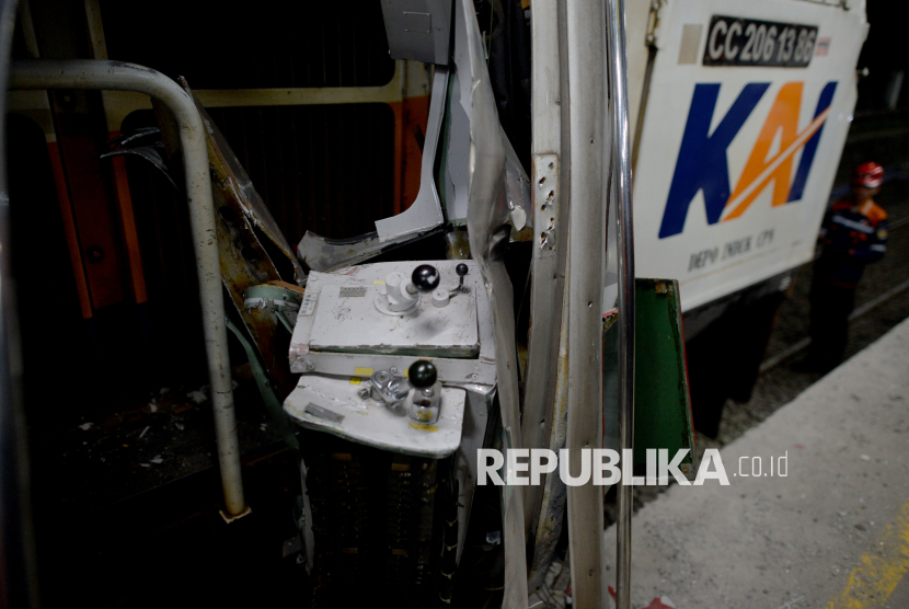 Rangkaian gerbong KRL Commuterline dan KA Argo Bromo Anggrek relasi Gambir-Surabaya Pasar Turi yang mengalami kecelakaan di Stasiun Bekasi Timur, Bekasi, Jawa Barat, Selasa (28/4/2026). Hingga Selasa pagi tercatat sebanyak 14 orang meninggal dunia dan 84 korban luka-luka akibat Kecelakaan KRL Commuterline dan KA Argo Bromo Anggrek. (FOTO : Edwin Putranto/Republika)