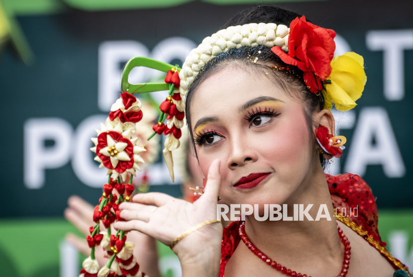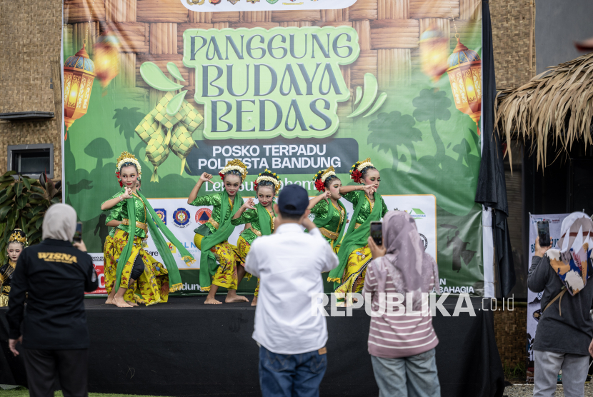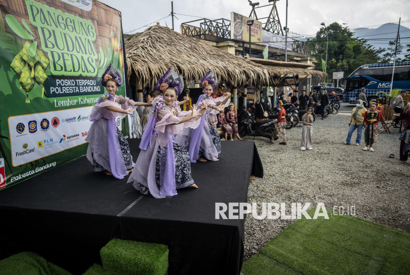 REPUBLIKA.CO.ID, BANDUNG -- Sejumlah penari menampilkan tari daerah di Panggung Budaya Bedas Posko Terpadu Lembur Kaheman, Jalan Raya Nagreg, Kabupaten Bandung, Jawa Barat, Ahad (15/3/2026).
