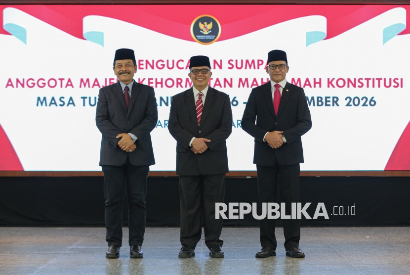 REPUBLIKA.CO.ID, JAKARTA -- Anggota Majelis Kehormatan Mahkamah Konstitusi (MKMK) I Dewa Gede Palguna, Yuliandri, dan Ridwan Mansyur mengikuti pengucapan sumpah anggota MKMK di Gedung MK, Jakarta, Rabu (7/1/2026).