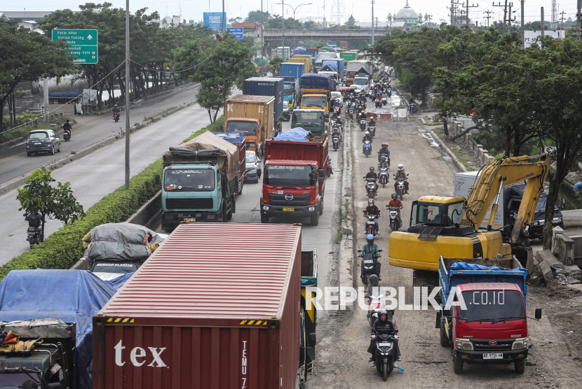 Sejumlah kendaraan melintas di samping proyek peninggian Jalan Pantura Kaligawe Raya, Semarang, Jawa Tengah, Sabtu (7/3/2026). Balai Besar Pelaksanaan Jalan Nasional (BBPJN) Jateng-DIY Kementerian Pekerjaan Umum mempercepat proyek peninggian jalan nasional di KM 3+900 hingga KM 4+600 jalur utama Pantura Semarang-Surabaya dengan target badan jalan siap berfungsi pada 11 Maret 2026 sebagai upaya mencegah terjadinya banjir musiman serta memperlancar arus mudik Lebaran 1447 Hijriah. (FOTO : ANTARA FOTO/Makna Zaezar)