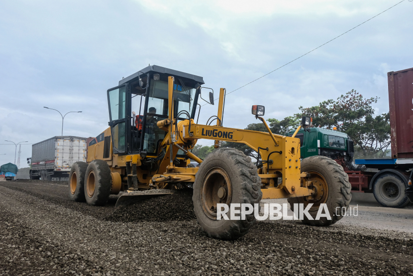 REPUBLIKA.CO.ID, SEMARANG -- Pekerja memadatkan material menggunakan alat berat dalam proyek peninggian Jalan Pantura Kaligawe Raya, Semarang, Jawa Tengah, Sabtu (7/3/2026).