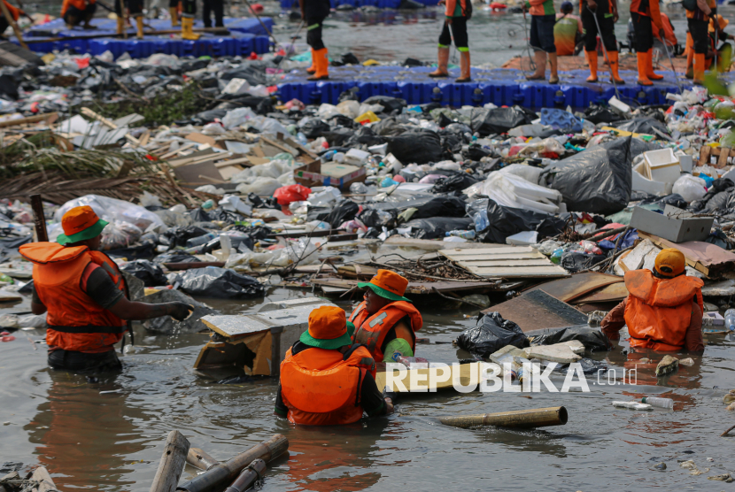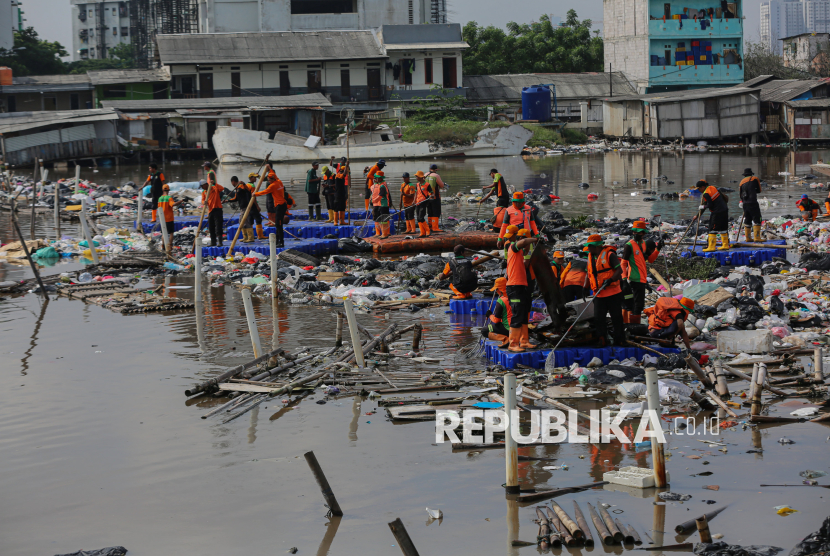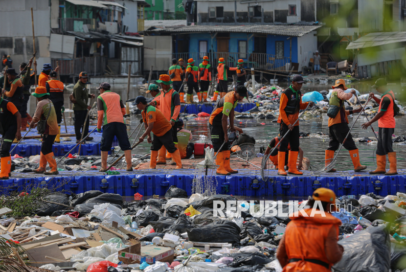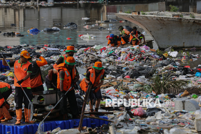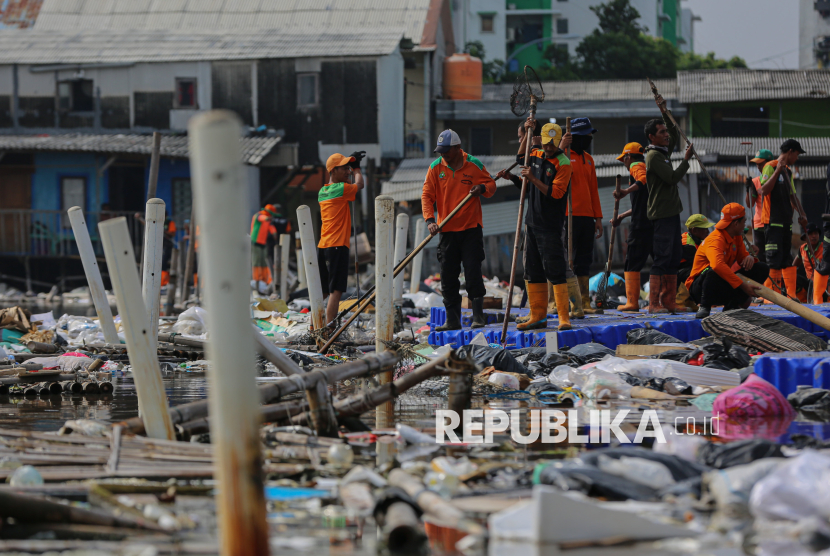 Petugas gabungan dari Dinas Lingkungan Hidup (DLH) Jakarta Utara dan Kepulauan Seribu membersihkan sampah yang menggenang di aliran Muara Baru, Jakarta Utara, Jumat (16/1/2026). Sebanyak 120 petugas DLH Jakarta Utara dan Kepulauan Seribu dikerahkan untuk membersihkan tumpukan sampah yang mencemari aliran muara dan mengakibatkan bau tak sedap serta berpotensi mengganggu kesehatan warga sekitar. (FOTO : Republika/Thoudy Badai)
