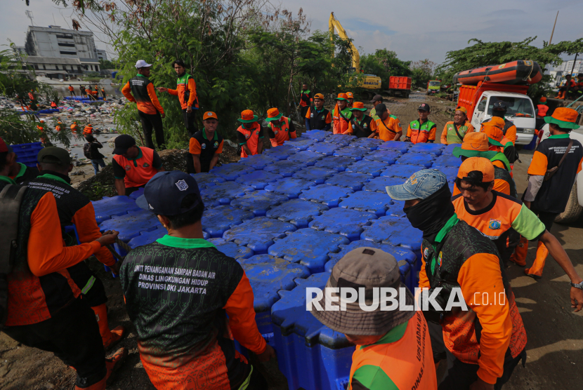 Petugas gabungan dari Dinas Lingkungan Hidup (DLH) Jakarta Utara dan Kepulauan Seribu membersihkan sampah yang menggenang di aliran Muara Baru, Jakarta Utara, Jumat (16/1/2026). Pengangkutan sampah dilakukan secara bertahap hingga Ahad (18/1/2026) mendatang. (FOTO : Republika/Thoudy Badai)