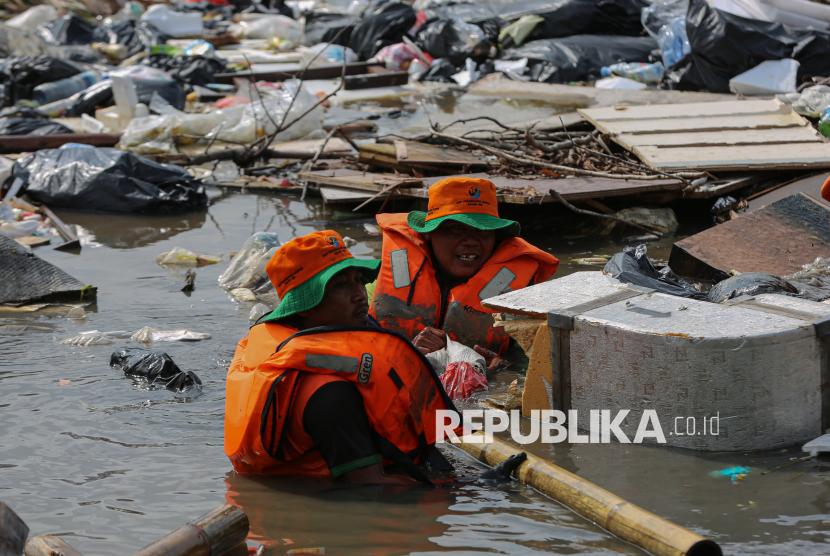 Petugas gabungan dari Dinas Lingkungan Hidup (DLH) Jakarta Utara dan Kepulauan Seribu membersihkan sampah yang menggenang di aliran Muara Baru, Jakarta Utara, Jumat (16/1/2026). Tumpukan sampah yang mencemari aliran muara berpotensi mengganggu kesehatan warga sekitar. (FOTO : Republika/Thoudy Badai)