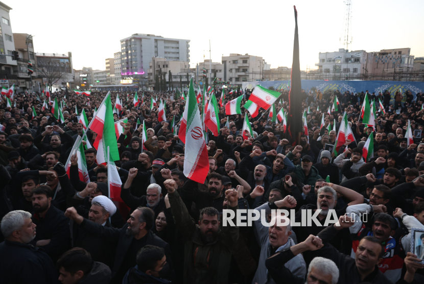 Kerumunan massa terlihat memadati jalan-jalan ibu kota Teheran. Mereka membawa bendera Iran serta foto-foto Khamenei sembari meneriakkan slogan-slogan anti-Amerika dan anti-Israel.