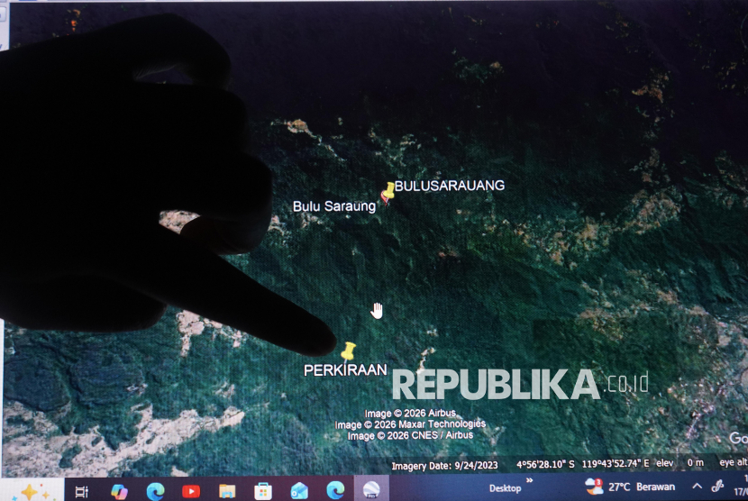 Anggota Basarnas menujukkan titik perkiraan lokasi hilangnya pesawat udara jenis ATR 42-500 di posko pencarian, Kelurahan Leang-leang, Kecamatan Bantimurung, Sabtu (17/1/2026). Tim gabungan dari Basarnas, TNI-Polri, Damkar dan lainnya masih melakukan proses pencarian hilangnya pesawat ATR 42-500 yang membawa delapan kru pesawat dan tiga penumpang di area Puncak Bulusaraung. (FOTO : ANTARA FOTO/Hasrul Said)